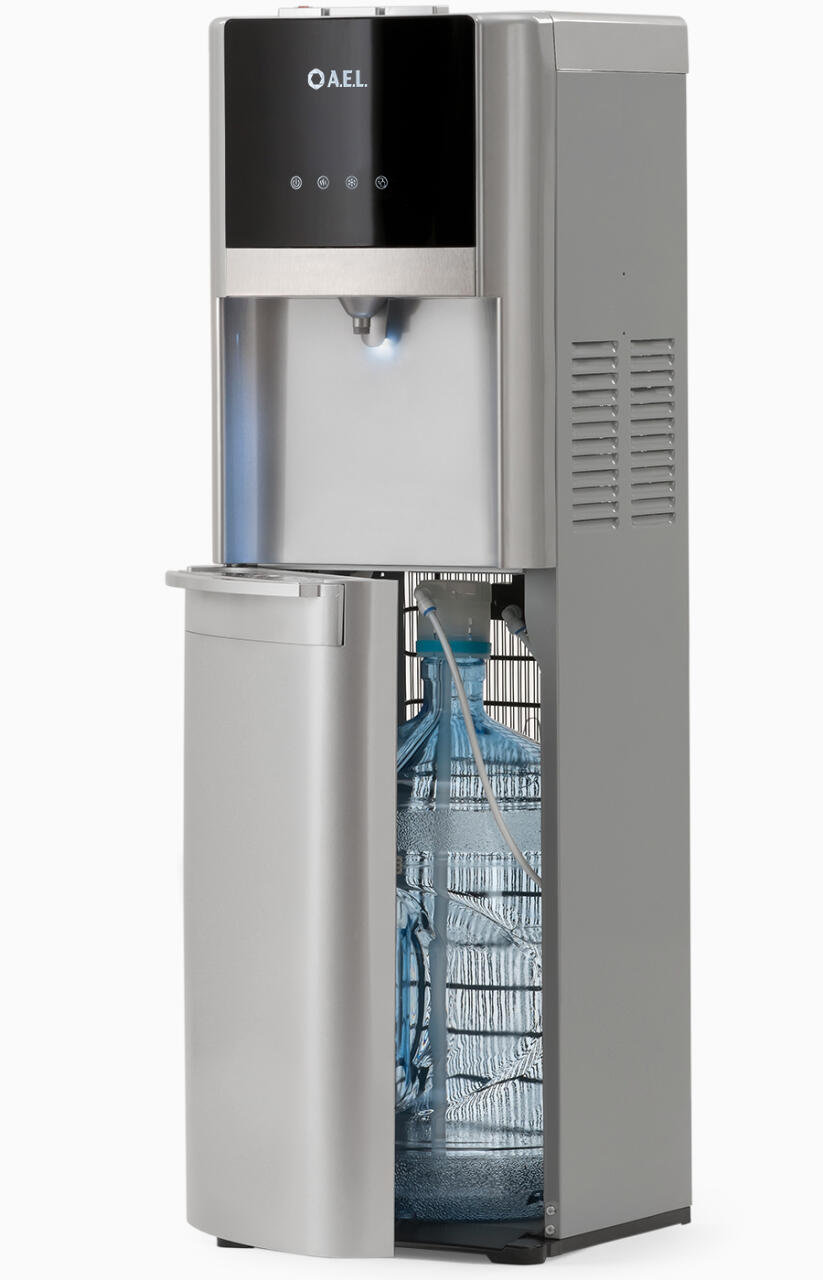 Кулер будет отлично смотреться в интерьере благодаря стильному дизайну, подсветке и нижней загрузке бутыли, закрывающейся дверцей. Снабжен 3-мя кнопками для воды холодной, горячей и комнатной температуры. Такое решение помогает экономить электроэнергию.В процессе эксплуатации аппарата в тот момент, когда вода в бутыли закончилась, на панели индикации загорится индикатор наличия воды в бутыли. Это символизирует о том, что необходимо заменить пустую бутыль.