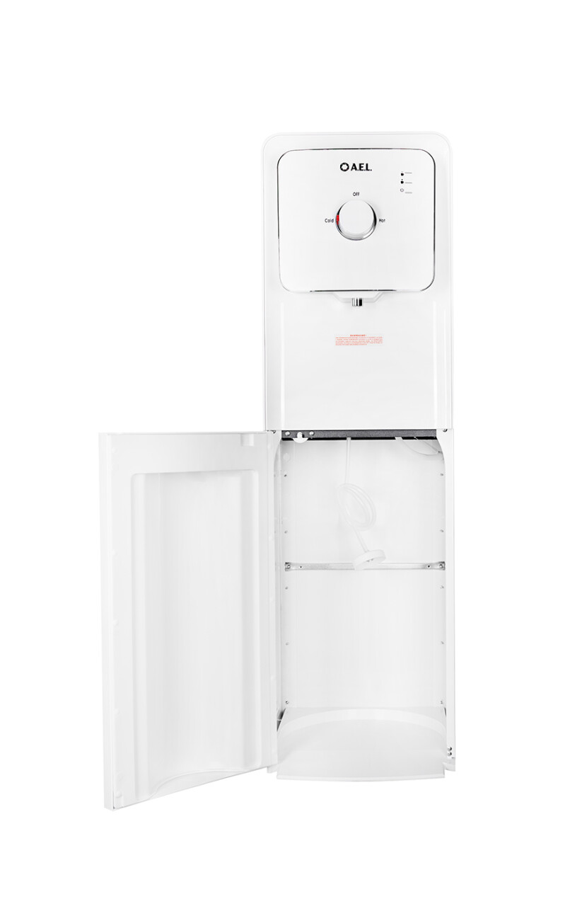 Новинка в ассортименте АЕЛ - напольный кулер с нижней загрузкой бутыли, электронное охлаждение с поворотным краном. Раздача воды горячей и холодной температуры. Для подачи воды нужно повернуть кран, для остановки подачи — вернуть его в исходное положение. Корпус полностью белого цвета. В процессе эксплуатации аппарата в тот момент, когда вода в бутыли закончилась, раздатся звуковой сигнал. Это символизирует о том, что необходимо заменить пустую бутыль.