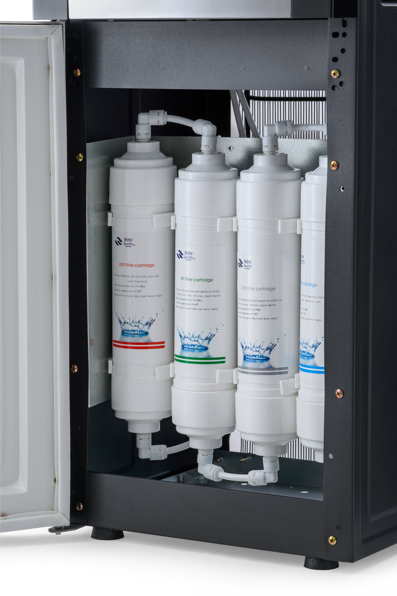 Представляем новинку в ассортименте АЕЛ - напольный пурифайер компрессорного типа с 4х UF-системой очистки. Модель комплектована удобными краниками нажим чашкой. Наличие функции энергосбережения. Возможность опциональной установки системы ультрафиолетового обеззараживания и защиты от протечек. Цвет: черный корпус с серебряными вставками, серебряными кранами, боковые панели черного цвета. кран врезки + трубка 1/4 - 3 метра фильтры тип - I тип фильтры размер - 12" мануал + типа фильтрации: Ультра фильтрация (используется 4 фильтра Фильтр Aquaalliance POS-C, Фильтр Aquaalliance PRE-C, Фильтр Aquaalliance SED-C, Фильтр Aquaalliance UFM-C) Для того чтобы пурифайер производил воду постоянного высокого качества и вкуса, необходимо регулярно производить замену фильтров. Для замены подойдут фильтры Aquaalliance 14 и 12 размера , I и U тип