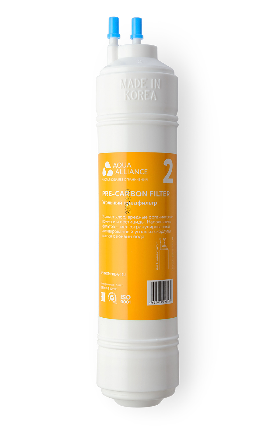Угольный предфильтр. Удаляет хлор, вредные органические примеси и пестициды. Наполнитель фильтра - мелкогранулированный активированный уголь из скорлупы кокоса с ионами йода.