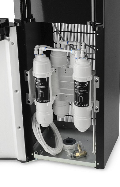 Напольный пурифайер c компрессорным охлаждением и с 4х UF-системой очистки. Модель комплектована удобными клавишами. Цвет: черный корпус с металлической вставкой.кран врезки + трубка 1/4 - 3 метра фильтры тип - U тип фильтры размер - 12" мануал + типа фильтрации: Для того чтобы пурифайер производил воду постоянного высокого качества и вкуса, необходимо регулярно производить замену фильтров. Для за